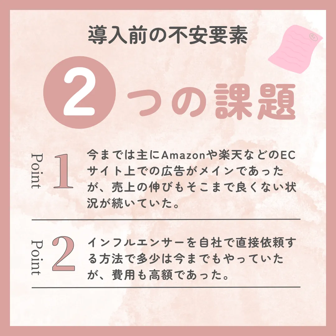 - 今までは主にAmazonや楽天などのECサイト上での広告がメインであったが、売上の伸びもそこまで良くない状況が続いていた。