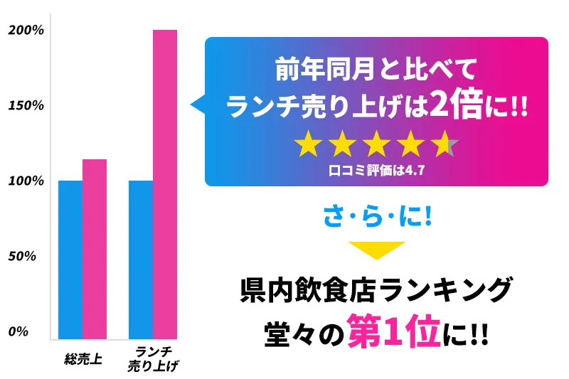 SNSとGoogleマップ集客サービス (#BridgePlus) を導入後、前年同月比で売上が107%向上し、評価も高まっています。特に口コミ数が増加し、評価が4.7に上昇、ランチ売上は"2倍"を達成しました。また、ニュースで取り上げられたことで、県内ランキングで"1位"に選ばれるなど、知名度と売上が大幅に向上しました!