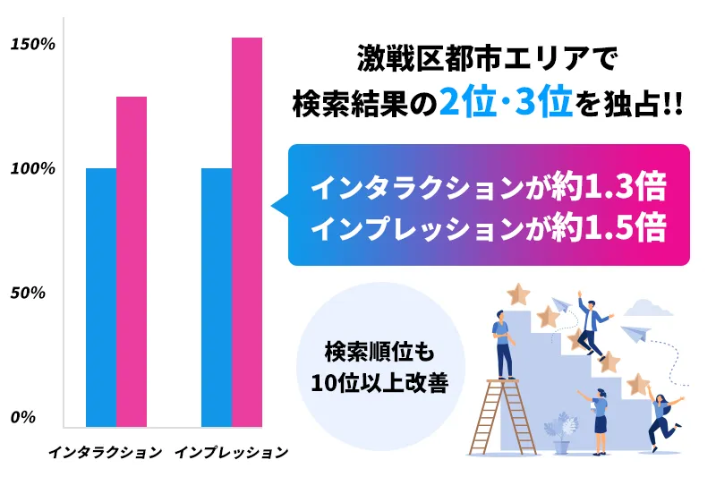 激戦区である都市エリアで検索結果の2位・3位を達成し、昨年同月比でインタラクションが約1.3倍、インプレッションが約1.5倍に増加しました。また、半年で"口コミが100件以上"増加し、業務コストもAIを活用した口コミ返信により大幅に削減されました。MEO施策により"検索順位も10位以上改善"し、知名度と新規患者の獲得に成功しています。他の導入事例でもランキング改善により売上向上が報告されています。