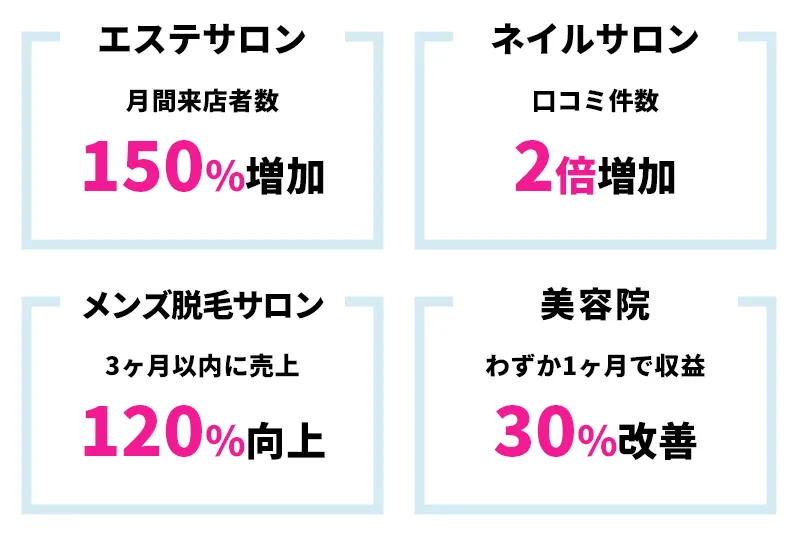 例えば、エステサロンは2023年の導入後、月間"来店者数が150%増加"し、ネイルサロンでは2023年の導入後、口コミ件数が"2倍"に増加しました。